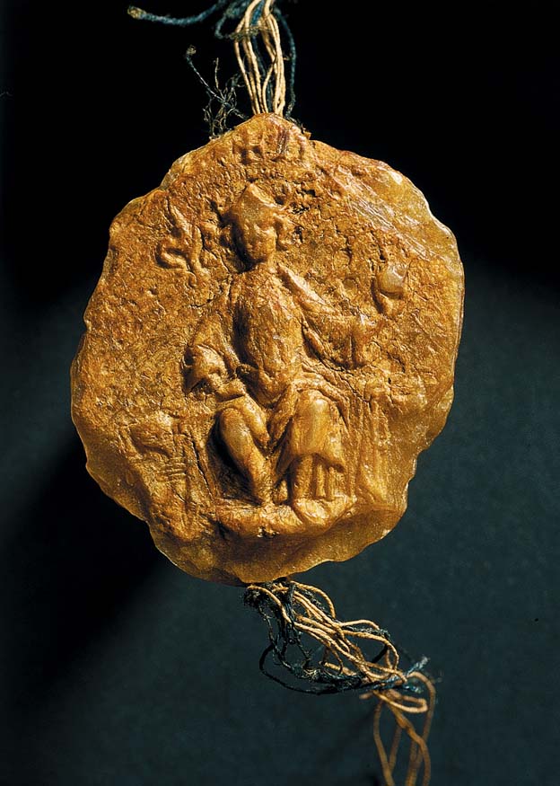 Единственное известное прижизненное изображение Миндовга сохранилось на печати, привешенной к договору между Миндовгом и Тевтонским орденом от октября 1255 года о передаче последнему Селонии. При этом печать сохранилась фрагментарно — легенда практически полностью отсутствует, различимы лишь крест, означающий начало надписи и элемент одной буквы, с равной вероятностью читаемая как латинские M, D или SI. Детальное описание печати было выполнено папским легатом в мае 1393 года. Согласно описанию, легенда печати гласила «MYNDOUWE DEI GRA REX LITOWIE» («Миндов Божией милостью король Литовии»), а сама она была привешена к документу белым и жёлтым шнурком, в то время как на сохранившемся оригинале шнурок белого и синего цветов.